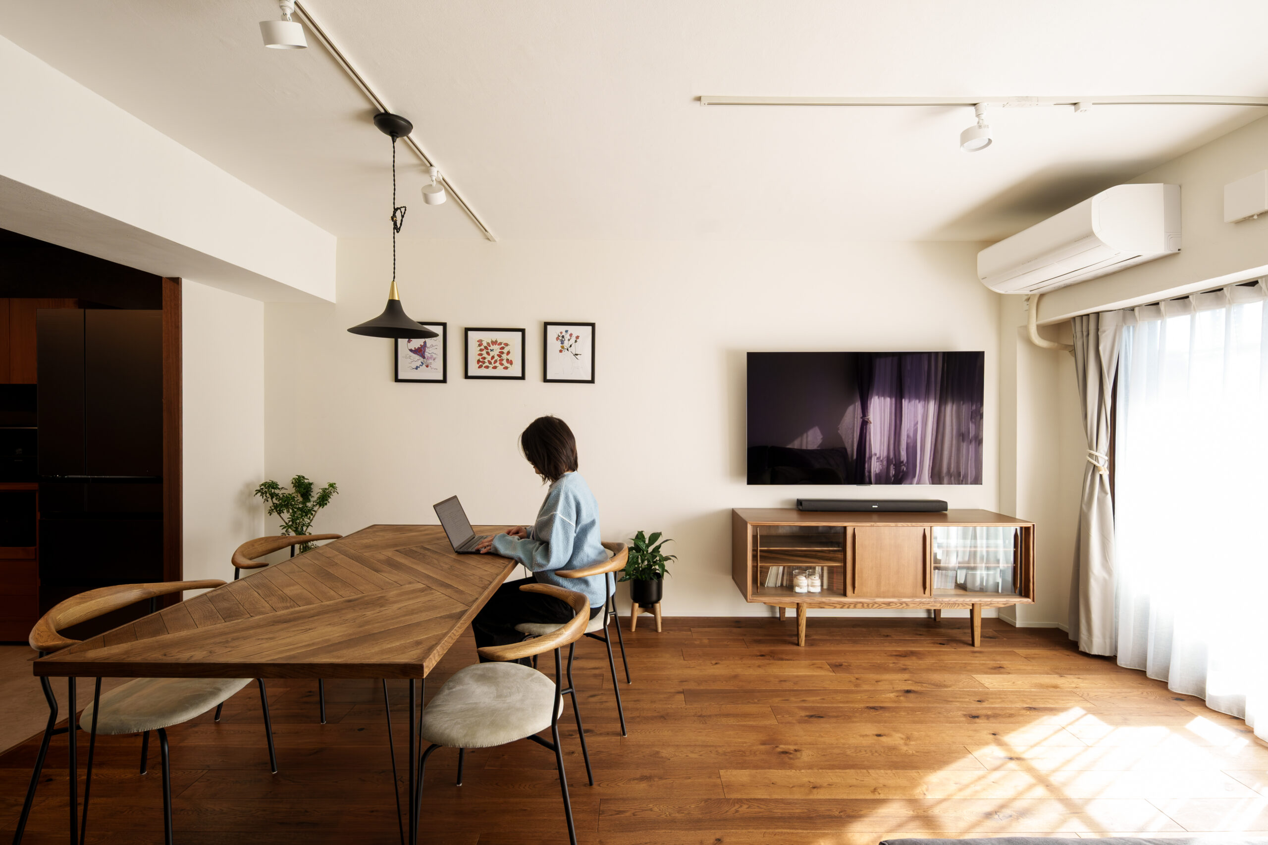 マンションリノベで手に入れた自分たちらしい住まい 腰壁をモルタルで仕上げたオリジナルの造作キッチン チークの床、漆喰の壁など自然素材を取り入れた、上質なデザインの新築注文住宅