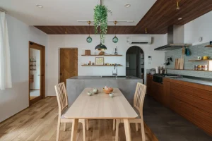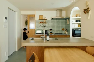 ▽キッチンを見て右壁面の壁にアーチ開口を設けた例。正面の壁でなくても可愛らしいアーチ開口を設けることができます。
