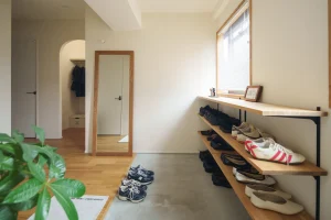 ▽ウォークインクローゼットの入り口をアーチ開口にした例。玄関から見たときに廊下の奥にアーチがチラ見えするのがポイントです。