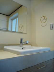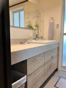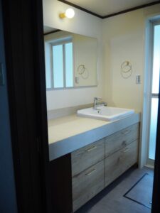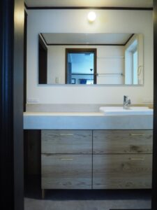 2年位前にカップボードとアイランドカウンターを製作させて頂いたお客様から、今回はオーダー家具で洗面台をご注文頂いたのでそちらのご紹介です。
