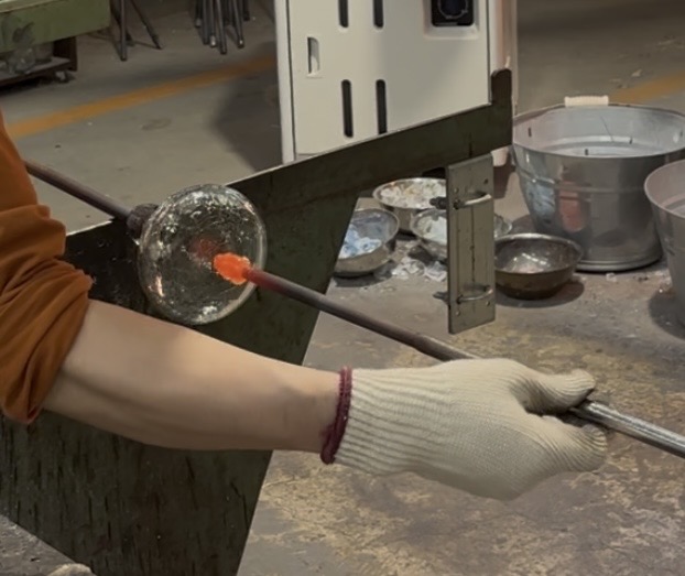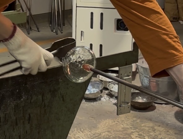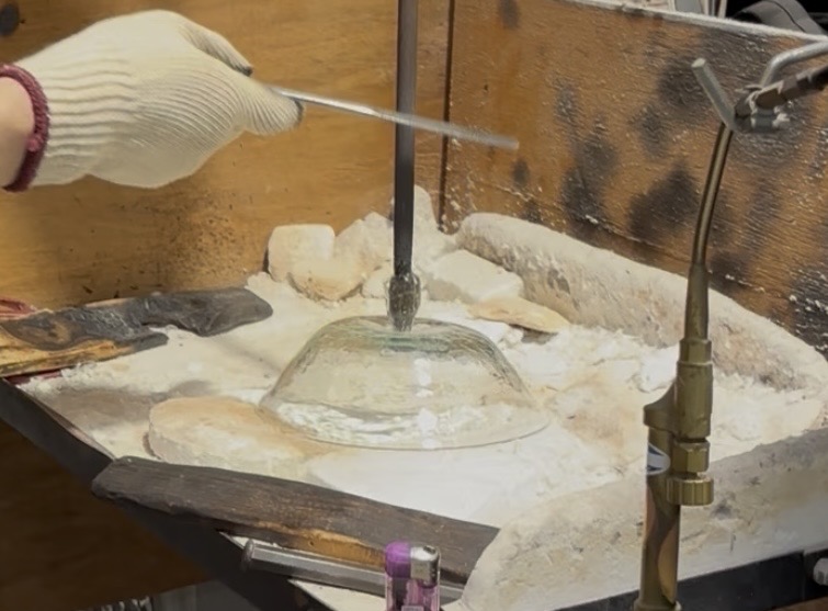 今回膨らませたお皿になるためのガラスにくっつけます。