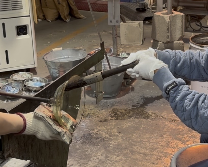 くっついたら、お皿になるためのガラスを、元の棒から切り離します。