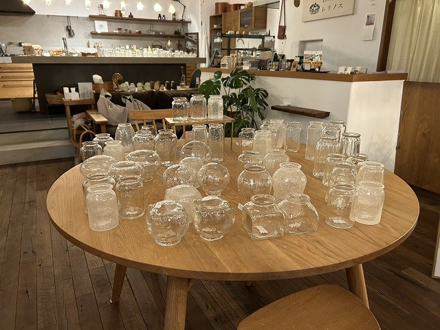 テーブルにもたくさんのガラスシェードが並んでいます。