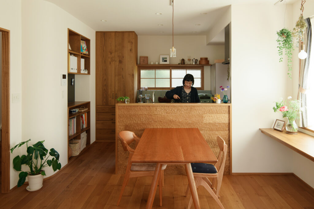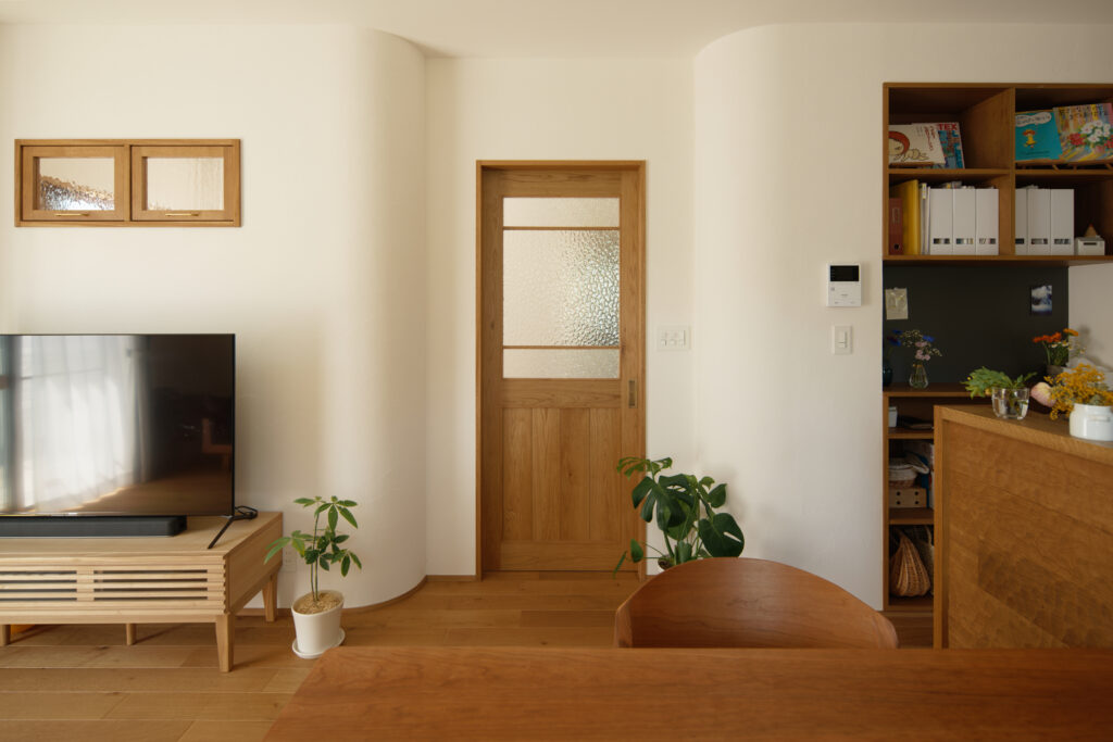 間取りだけでなく、漆喰の壁やオークのフローリング、オーダーキッチン、造作建具、木製の室内窓など、細部にまでこだわった素敵なお宅です。
