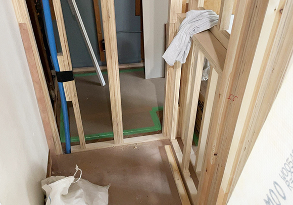 フローリングが貼られた部分はしっかり養生しておきます。配管や配線が複雑に絡みますが、うまくかわしながら壁を立ち上げてくれています!