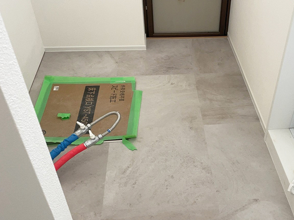 洗面脱衣室の床は明るいお色に!スペースもグッと広くなりましたので、のびのびお使いいただけるといいなぁ…
