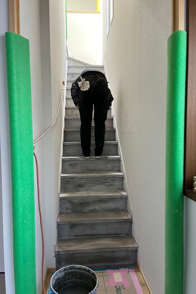 階段の塗装作業も進めています。床の色やサンプルに合わせて、毎回調色しています。このあたりも仕上がりに差が出るポイント!