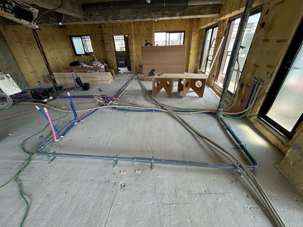 床にある給排水管を見ると、キッチンが部屋の真ん中に設置されるのが分かります。