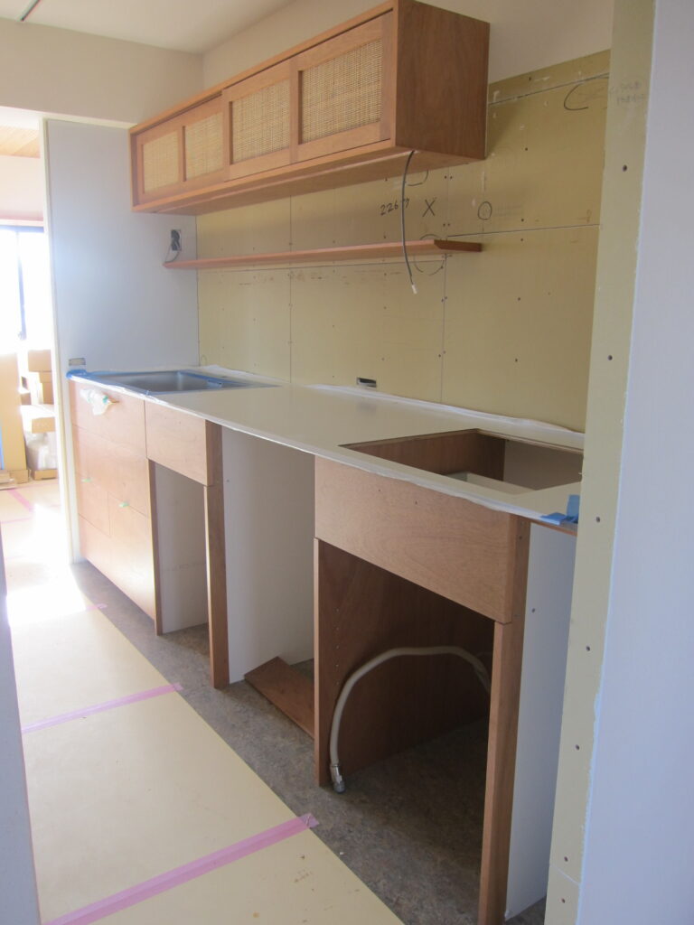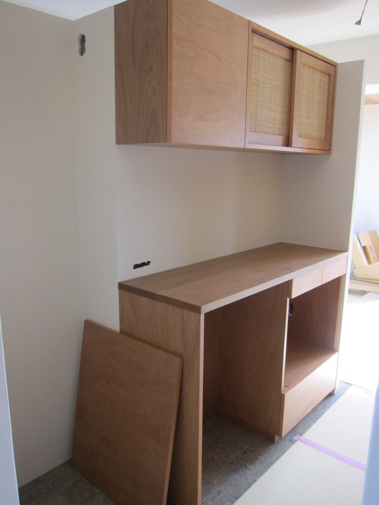 キッチン向かいにある作業スペース。こちらも固定棚とカウンターが設置されました。