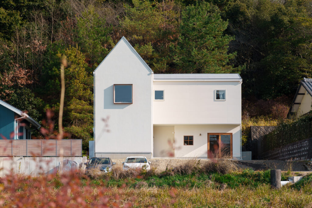 その立地の魅力を活かし、自然の中でひときわ目を引く、白く小さな三角屋根の家を計画しました。