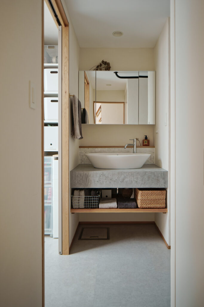 無垢材のフローリング、漆喰の壁と天井、モールテックスの洗面台など、素材にもこだわった素敵な空間です。