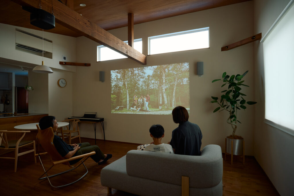 LDKは2階に配置し、壁面の大きなスクリーン&こだわりの音響で、ご家族が楽しく過ごせる空間に。