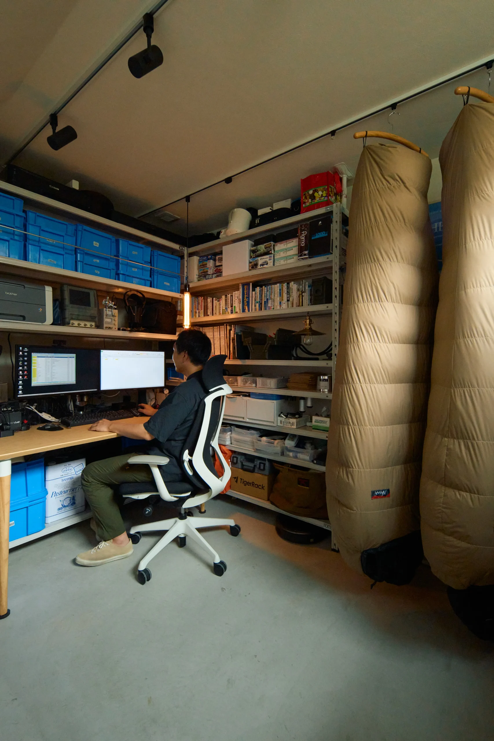 「見せる収納」にした愛着のあるギアを眺めながら、作業やメンテナンスを楽しめます。