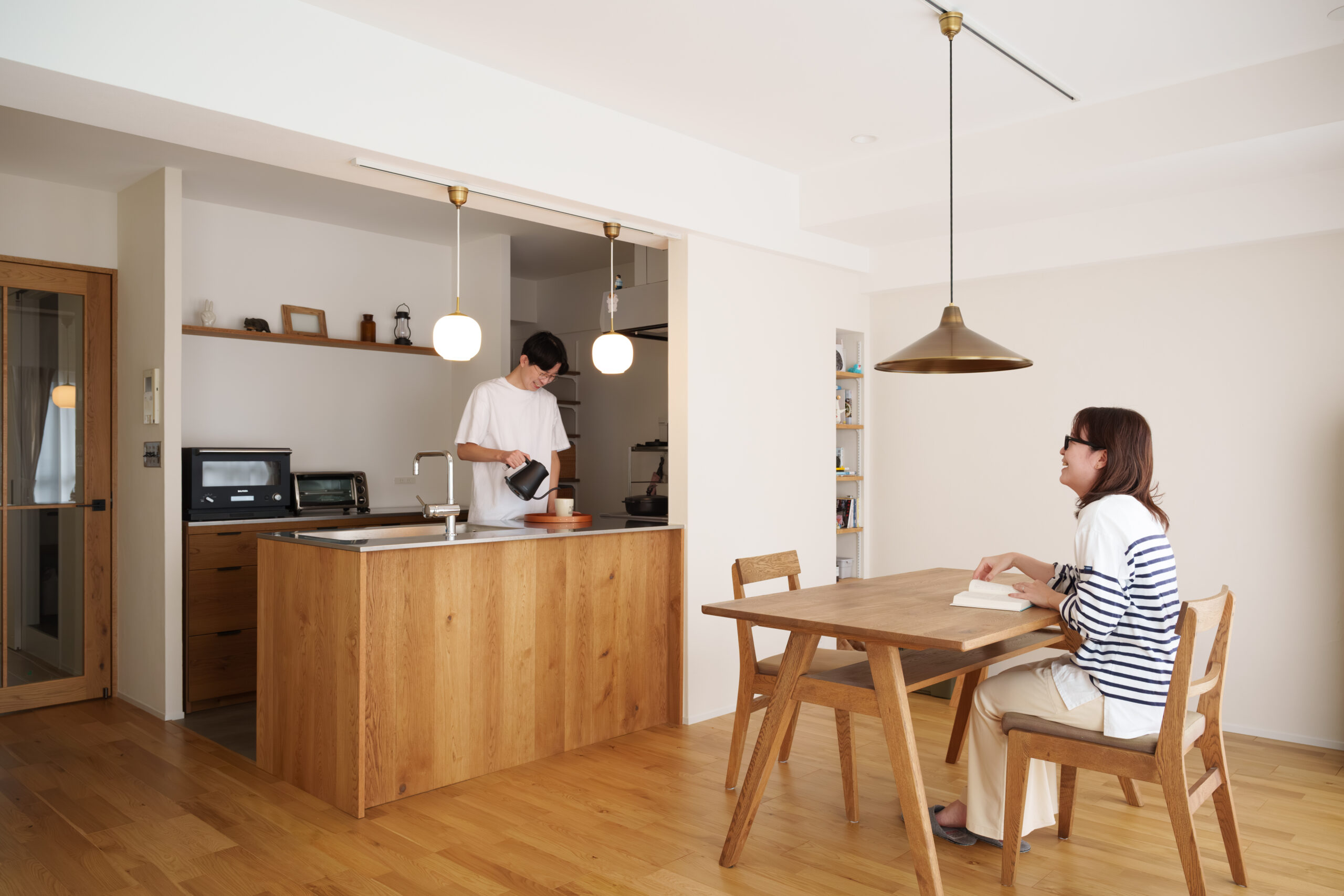 マンションリノベで手に入れた自分たちらしい住まい 腰壁をモルタルで仕上げたオリジナルの造作キッチン チークの床、漆喰の壁など自然素材を取り入れた、上質なデザインの新築注文住宅