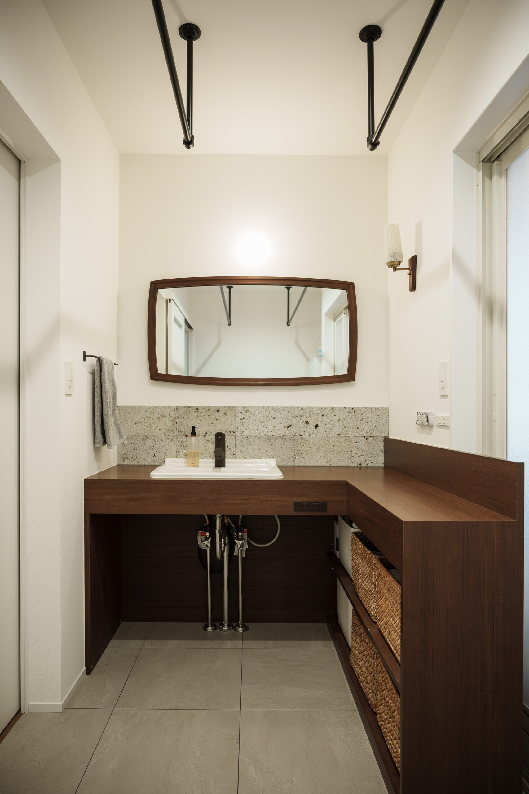 洗面には大きなヴィンテージの鏡を掛け、照明も理想のものを探して設置しました。