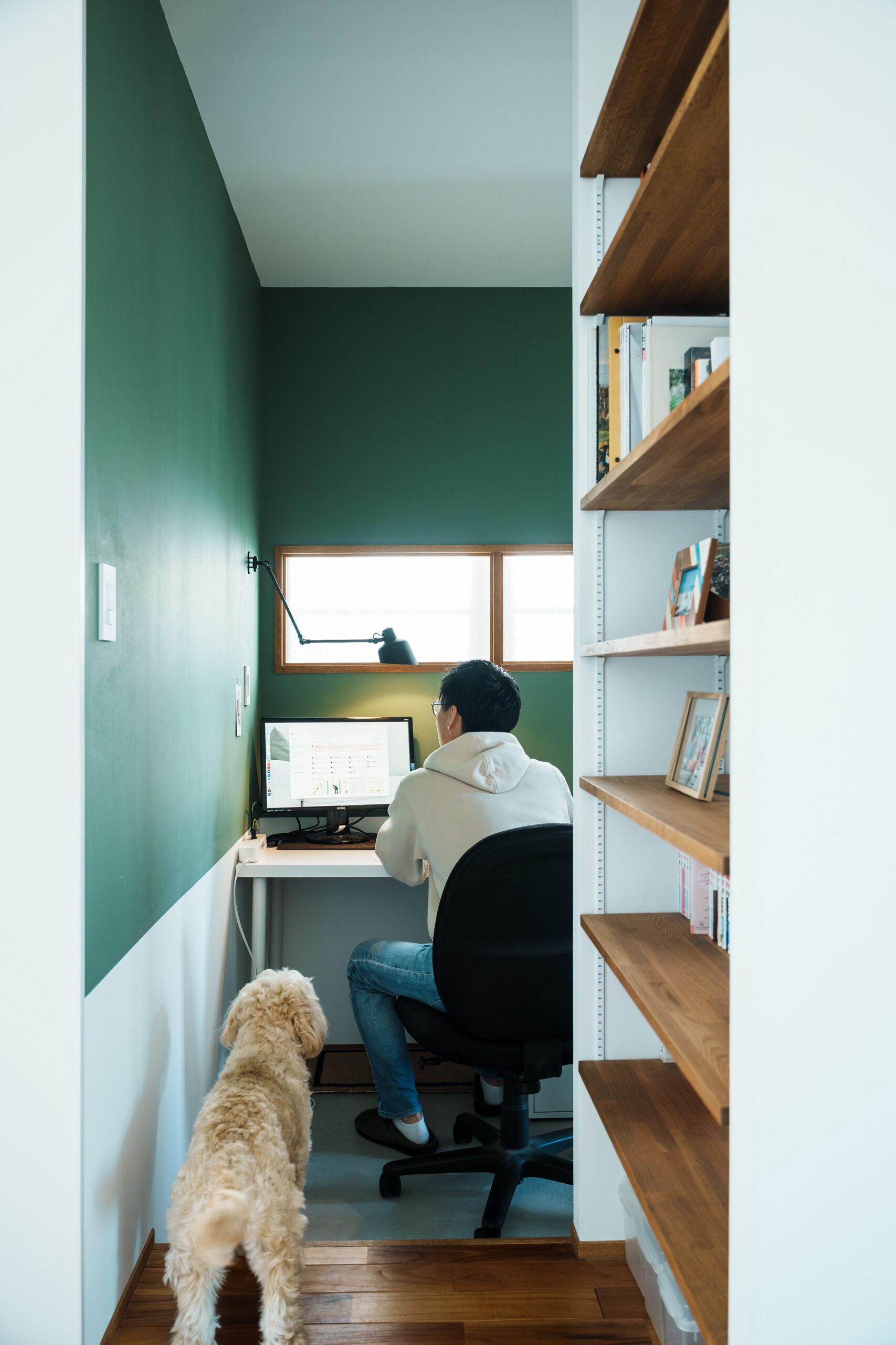 書斎の壁は自分たちで塗装し、家具もヴィンテージショップやフリマで少しずつ集めています。