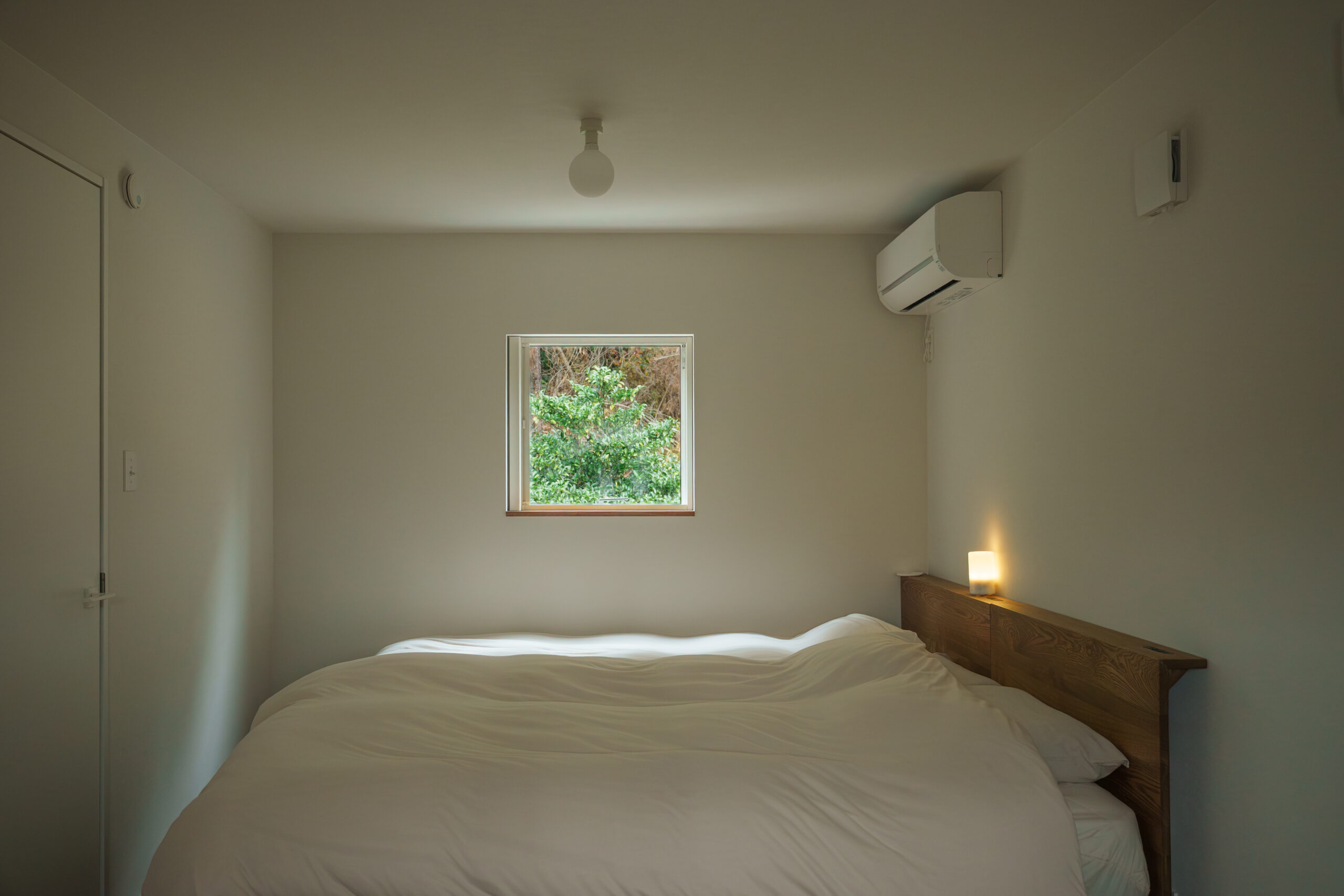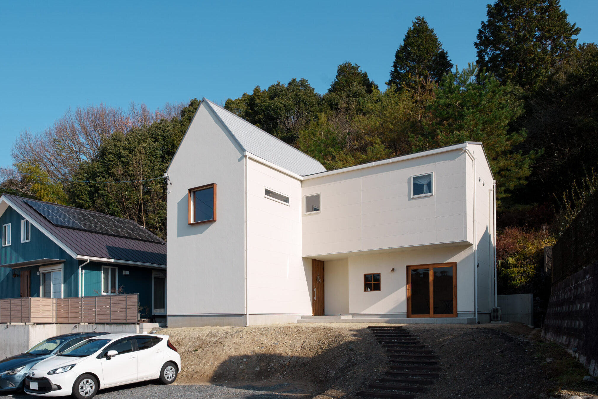 その立地の魅力を活かし、自然の中でひときわ目を引く、白く小さな三角屋根の家を計画しました。