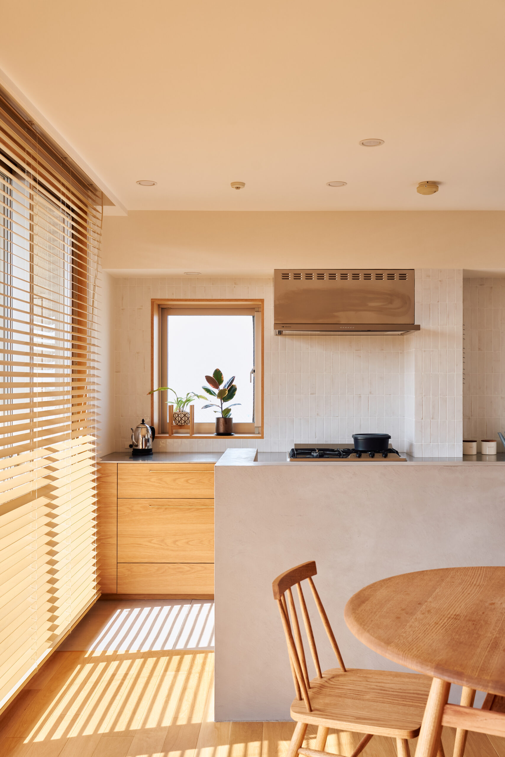 ナチュラルな素材と落ち着いた色合いを基調に、モールテックスを用いたオーダーキッチンや漆喰の壁など、人の手が生み出す温かみを感じる仕様を随所に取り入れました。